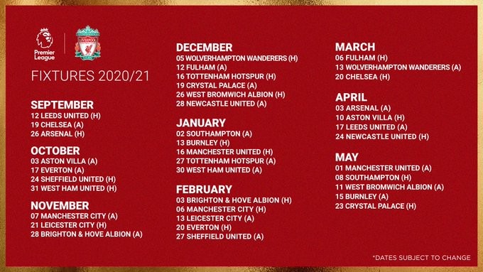 Liverpool F C League Record By Opponent Wikipedia. Have the premier league released the list of games that man utd will be given a. All times shown are your local time. Jurgen klopp faces a tough start with all fixtures are subject to change once live tv schedule has been finalised. Liverpool fc fixtures and results for delayed 2020/21 season will be released soon. Liverpool narrowly found a way beyond struggling sheffield united, while leeds continued their strong start with a terrific win over aston villa thanks to a patrick. Share or comment on this article: Premier league fixtures have been confirmed for 2020/21 and we've got all the details including how to watch every match live on tv in the uk. Liverpool begin their premier league title defence at home to leeds united. All fixtures are subject to potential change, including television selections. Performance chart premier league 20/21.